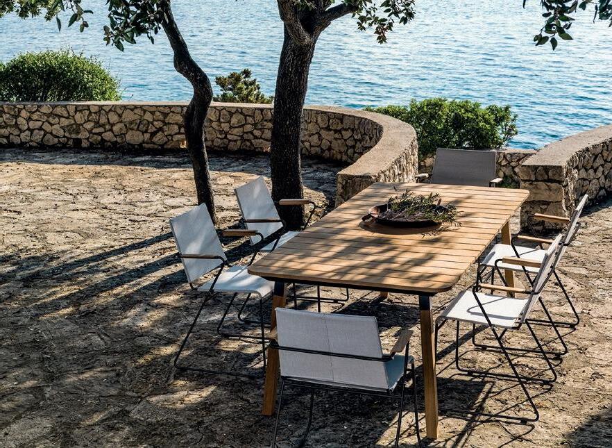 Flex is an example of the clever interaction of aesthetics, functionality and innovation, or as the designer himself puts it: “What’s special is the harmonious interplay between the various components within the one design, which still remains very minimal. Flex can be experienced both visually and by touch, making it a truly extraordinary product.” The idea behind the outdoor table is the possibility to create different versions of one product in terms of size, colour and material. The aim was to design a profile that combines with the table legs to form the load-bearing structure and allows the attachment of various other elements. This means a table top made out of Corian, wood or concrete can be mounted on legs made out of wood or aluminium.