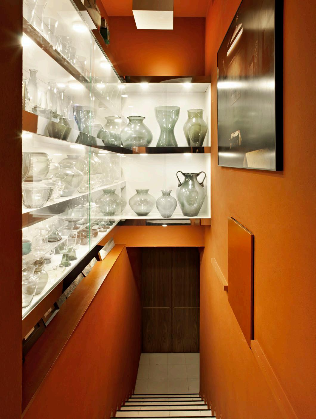 The staircases and corridors are treated as spaces in their own right and not just as intermediate spaces. The stairs are bathed in vivid orange, which links the main area with the other spaces. In one of the two guest bedrooms, there is an impressive collection of vases by Wilhelm Wagenfeld, a designer and teacher of the Bauhaus art school who wasn’t very well known in Italy but had major exhibitions at locations such as MoMa. The stairs have a transparent balustrade that leads up to the other guest bedroom, which functions as a gallery space for a range of oil paintings by French artist Vincent Ruffin.