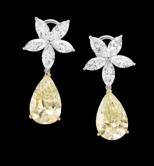Extravagance in form and colour: refined jewellery with Fancy Yellow Diamonds can’t be outdone when it comes to radiance. Even if they display identical parameters in terms of colour, cut, clarity and carat, none of the extraordinary stones equals the other, therefore they are justifiably part of the Fancy Coloured Diamonds group. The Fancy Yellow Diamonds selected for Bucherer Fine Jewellery are all classed as being in the extremely rare yellow category and are available as Fancy and Fancy intense. Only a handful of these rare gems are obtained around the world every year. Thanks to its cut, the stone receives its dazzling fire, playfully catches and reflects the light and therefore demonstrates the full extent of its craftsmanship. This is the case for the pear cut in particular, which is a combination of the elliptical marquise shape and traditional round Brilliant cut. This complex faceting results in even greater symmetry and brilliance to really emphasise the depth of colour of a diamond in an exceptional way.