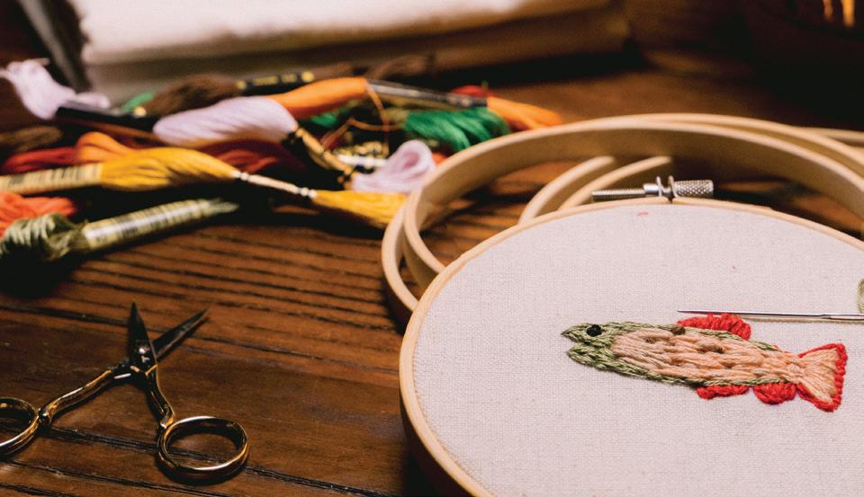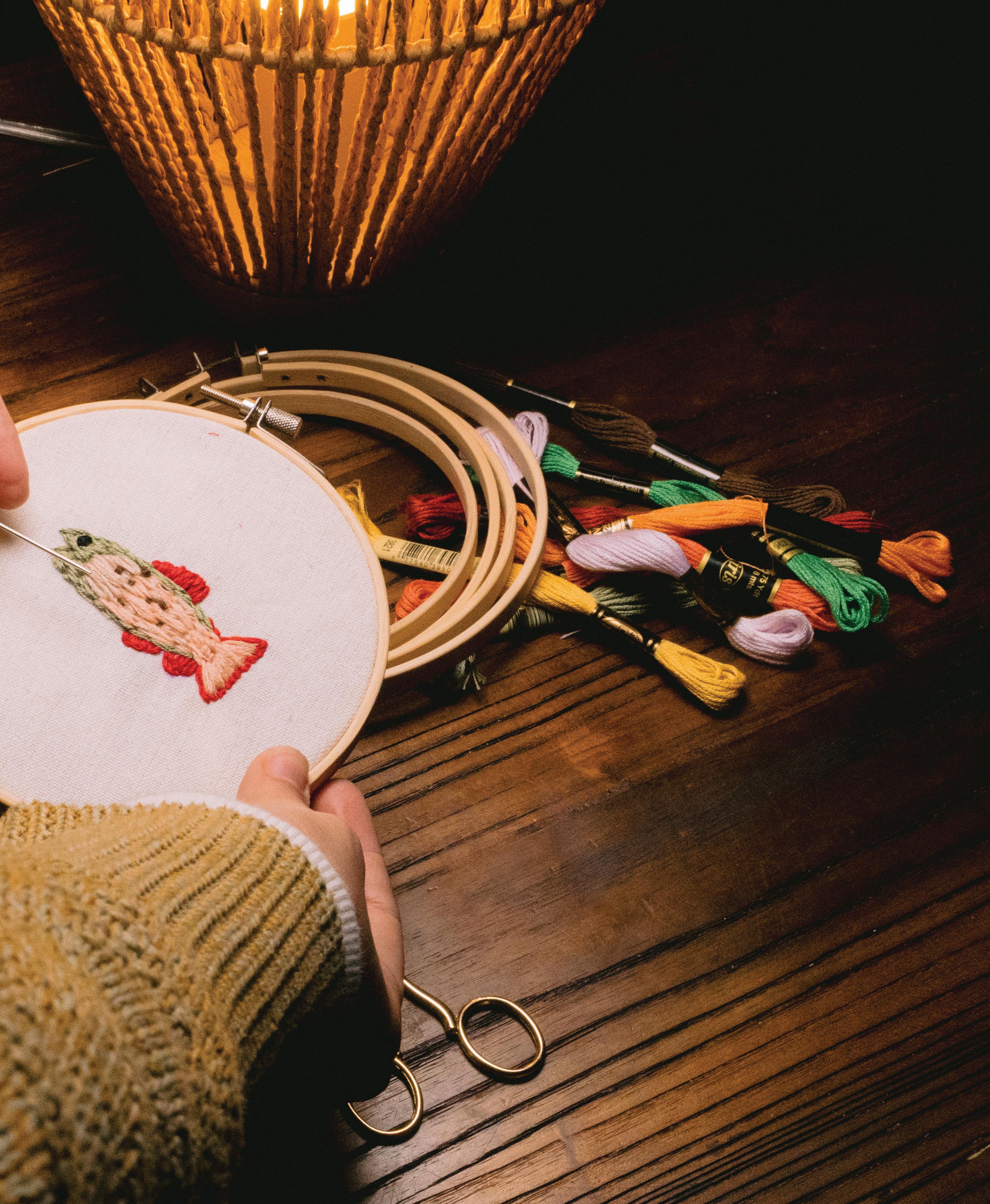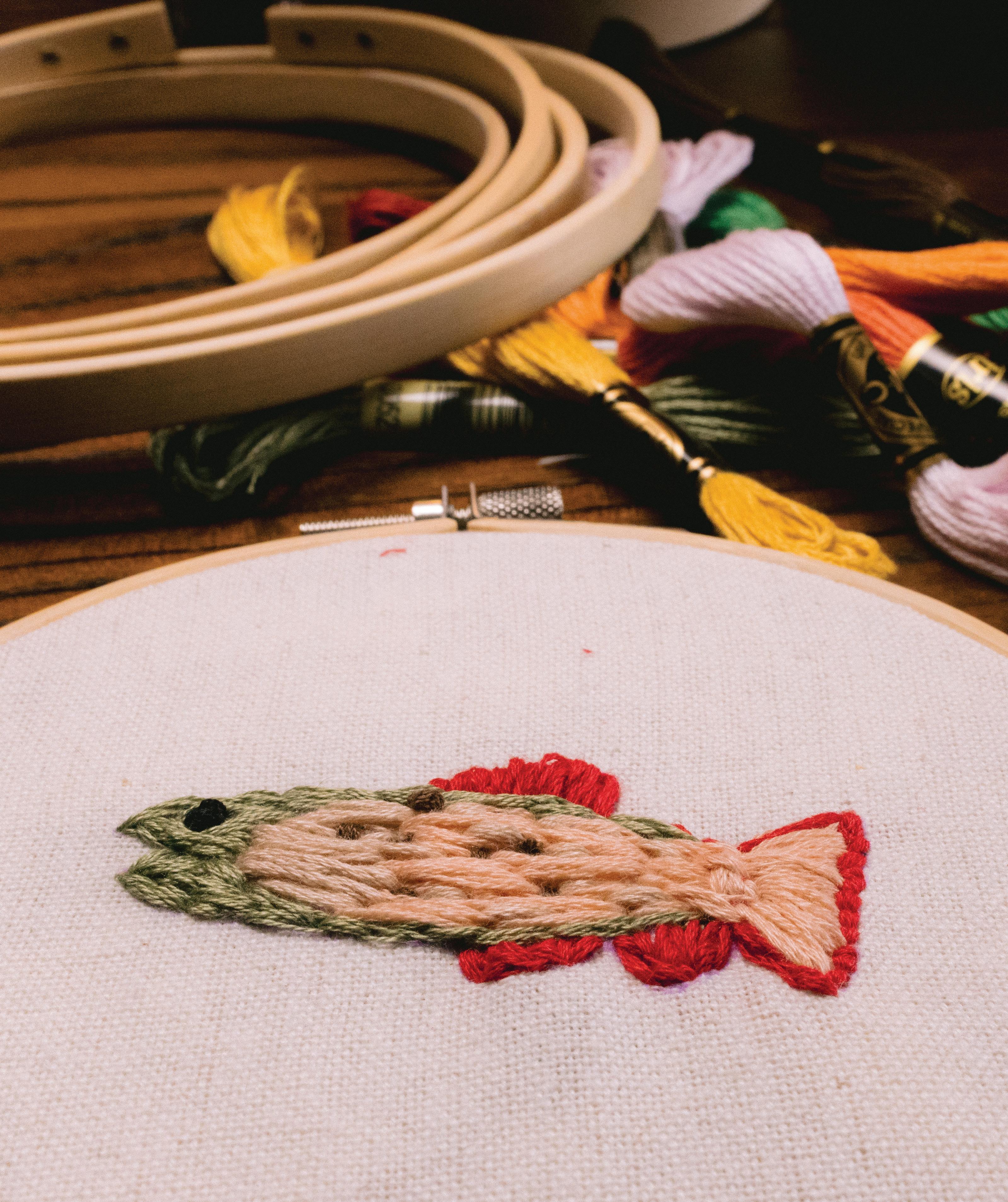 Whether you’re embroidering a cheerful message onto a tote bag, adding detail to a pillow, or framing a whimsical piece of hoop art, like this little fish, the end result is a tangible source of pride.