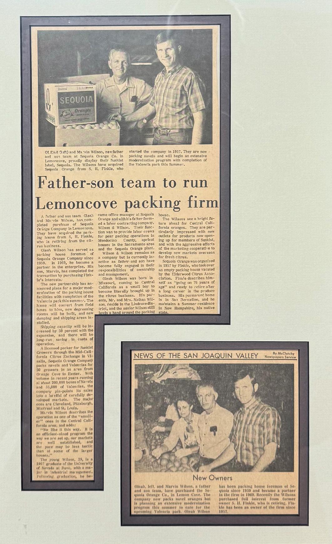 When 13-year-old Oleah Wilson left eighth grade in 1922, he had no idea that his family's journey in citrus farming was about to begin. Oleah began working for Sam Finkle, the original owner of Sequoia Citrus Association. Sam, who had no children of his own, eventually offered half of the company to Oleah. And later, upon Marvin Wilson's (Oleah's son) graduation from University of Nevada, Reno, Marvin purchased the remaining half from Sam.