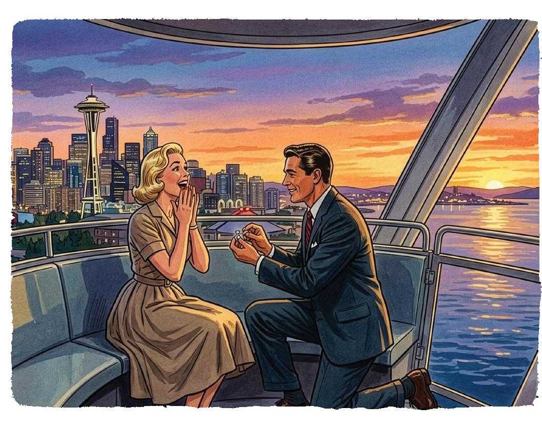 Acouple months prior, I had decided it was time to propose to Casandra, and commissioned a custom ring for her. I wasn’t sure where I would “pop the question,” though I had ideas. It needed to be a beautiful, meaningful destination. As it happens, I’d booked us a sleeping cabin on Amtrak to head to Seattle for a long weekend, and as the trip approached, it became clear: the city would make a great proposal backdrop.