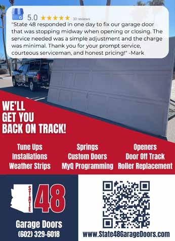 LIVE LIFE WE’VE GOT YOU COVERED Wood | Luxury Vinyl Plank | Carpet | Tile 480.498.8747 www.gilafloors.com D L C WHOLE HOME SOLUTIONS WWW.DLCWHS.COM Let our family take care of yours! Our Services: Repair and Maintenance: Major Home Appliances Arcade Machines / Pinballs LED/LCD TV Commercial Kitchen Equipment Office Hours : M-F 8am-4pm Service Hours : M-F 9am-6pm Office : 623-401-3525 Home Appliances Repair and Maintenance WITH THIS COUPON. MUST CONTRACT BY 12-31-23. NOT VALID WITH ANY OTHER OFFERS OR DISCOUNTS. Financing Available and Credit Cards Accepted www.Spencer4HireRoofing.com FULL ROOF REPLACEMENT $1000 OFF BESTOF 2019 CALL SPENCER 4 HIRE ROOFING TODAY TO SCHEDULE YOUR FREE ROOF INSPECTION. AHWATUKEE’S PREMIER ROOFING 28