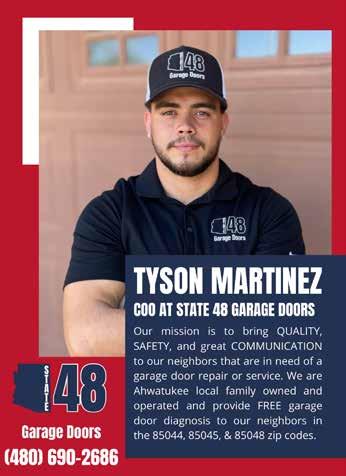 Your Gate is Our Specialty! Gate Expansions | Privacy Walls Trash Enclosures | Dog Runs Trellis’s | Secure Gate Keypad Entry TEXT OR CALL | 480 . 331 . 3704 WWW.RENOVATEYOURGATE.COM FREE Resident-made Sugar Scrub with a tour! Now O ering a Furnished, Shared Suite! Secure, Open and Naturally Lit Neighborhoods Fresh, Home-Style Meals Trained and Caring Tenured Sta Visit today and learn how we can make a di erence for your family member experiencing dementia. We have a compassionate sta that wants to meet and care for your loved one. 13822 South 46th Place • Phoenix, AZ (480) 598-1224 ww w.h a w t horn c ou r t s eniorlivin g . c o m fo llow us on fa cebook Visit today and learn how we can make a difference for your family member experiencing dementia. We have a compassionate staff that wants to meet and care for your loved one. ◆ Now Offering a Furnished, Shared Suite! ◆ Secure, Open and Naturally Lit Neighborhoods ◆ Fresh, Home-Style Meals ◆ Trained and Caring Tenured Staff 13822 South 46th Place • Phoenix, AZ (480) 598-1224 www.hawthorncourtseniorliving.com follow us on facebook HawtHorn Court at aHwatukee a Memory Care Community FREE Resident-made Sugar Scrub with a tour! 15920 South 48th Street • Phoenix, Arizona 85048 480-687-1008 | risingskygymnastics.com | risingskygymnastics@gmail.com The Sky is the Limit! GYMNASTICS • TUMBLING • PARKOUR/NINJA SPECIAL NEEDS • BIRTHDAY PARTIES • CAMPS • OPEN GYM AND MANY MORE SPECIAL EVENTS! 1 st Class is FREE FREE Open Gym 1st Saturday of each month 30