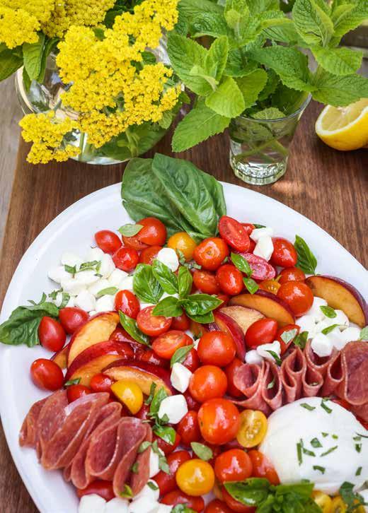 • Place the burrata cheese round on a platter. Arrange the tomatoes, peaches, salami and mozzarella balls around cheese.