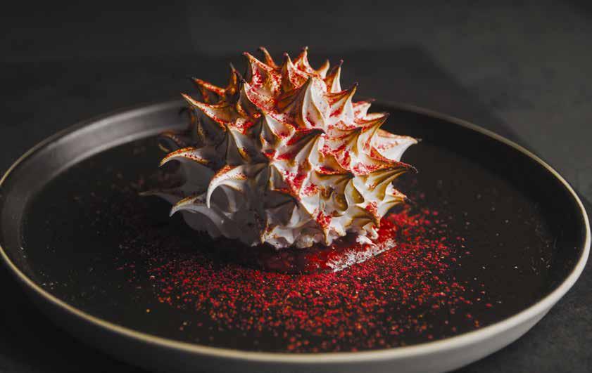 Of course, dessert also lends itself to statement plating. Prime, A Shula's Steak House ( PlayAtGila.com ) blows the doors off during dessert with its Baked Alaska ($11). The white and red-spiked Italian meringue masterpiece paired with key lime gelato, shortbread, and raspberry compote is next-level striking. Not to be outdone Kai Restaurant ( KaiRestaurant.com ). Each of the dishes on its tasting menu ($185 per person) is a piece of edible art, but especially I'itoi's Garden, a sweet menagerie of hibiscus and lavender pavlova, lemon curd, color-changing butterfly pea powers, orange-kissed ganache, and crème anglaise.