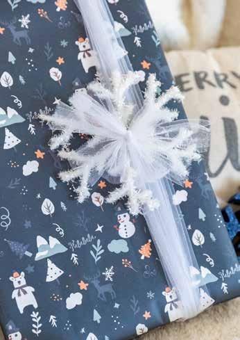 A sophisticated navy background features a subtle print of bears and deer. Top the package with sheer white tulle and a snowflake ornament for a whimsical, cozy look. Get the look: wrap: Zazzle; white tulle: Amazon; topper: Hobby Lobby.