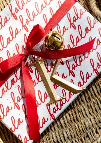 Personalize presents with a golden initial charm tag. Paired with playful fa la la script paper and a rich red ribbon, this look is traditional yet tailored. Get the look: wrap: Sugar Paper; ribbon: Hobby Lobby; initial: Michaels.