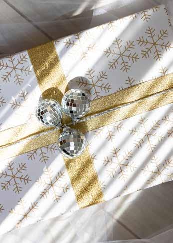 Bring the party to your presents with white paper and gold glitter snowflakes topped with metallic ribbon. Disco ball ornaments are the star, adding an unexpected, glamorous element. Get the look: wrap: Paper Source; ribbon, disco balls: Michaels.