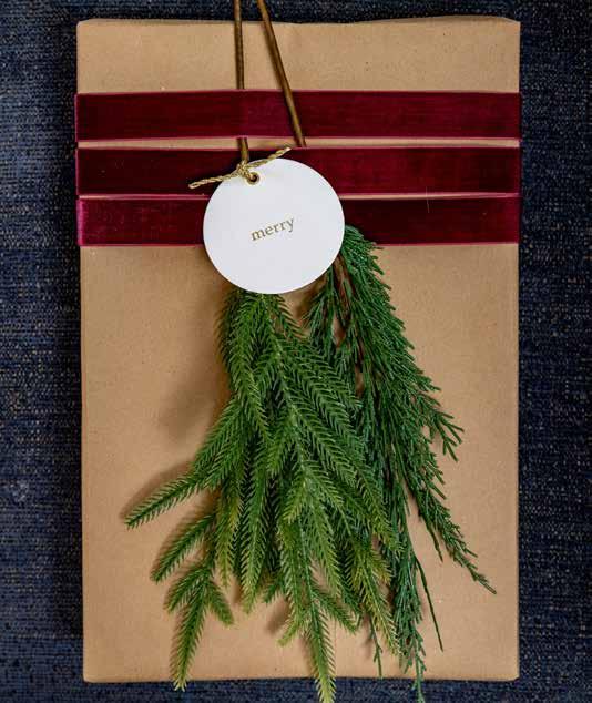 Simple materials make the biggest statement. Classic kraft paper is secured with a deep velvet ribbon. Fresh or faux cypress or pine adds texture and scent for an elegant, organic look. Get the look: Kraft wrap, velvet ribbon: Michaels; tags: Amazon; greenery: Target.