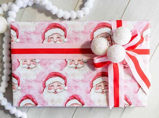 Break tradition with a feminine twist on Saint Nick, featuring pink watercolor paper that is both charming and playful. Layer pink and red ribbons, and finish the look with whimsical white glitter pompoms. Get the look: wrap: Aspen and Arlo; ribbons: Etsy; pom-poms: Hobby Lobby.