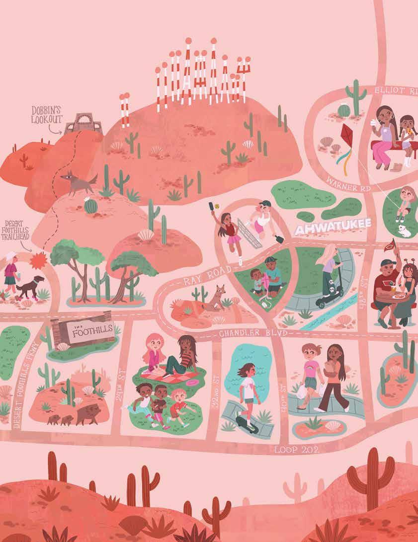 Our first hope is that you love this cover as much as we do. We discovered Miki Rose on Instagram and knew her style would be perfect to beautifully craft this ode to Ahwatukee. She skillfully (and delightfully) captured so many things that make our community incredibly special. While impossible to capture them all, she features a myriad of high points.