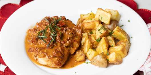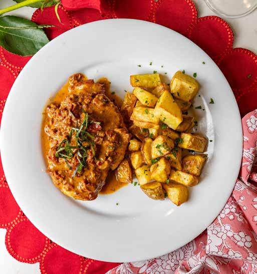 Chef Mackenzie Larsen of Larsen Culinary has crafted the perfect Valentine’s Day menu, starting with the viral sensation that’s been breaking the internet: Marry Me Chicken. This sun-dried tomato and cream-based dish earned its name for good reason. It’s so delicious, legend has it that anyone who tastes it will propose on the spot. Paired with fragrant rosemary potatoes that offer the perfect crispy yet tender bite, this main course strikes an elegant balance between comfort and sophistication.