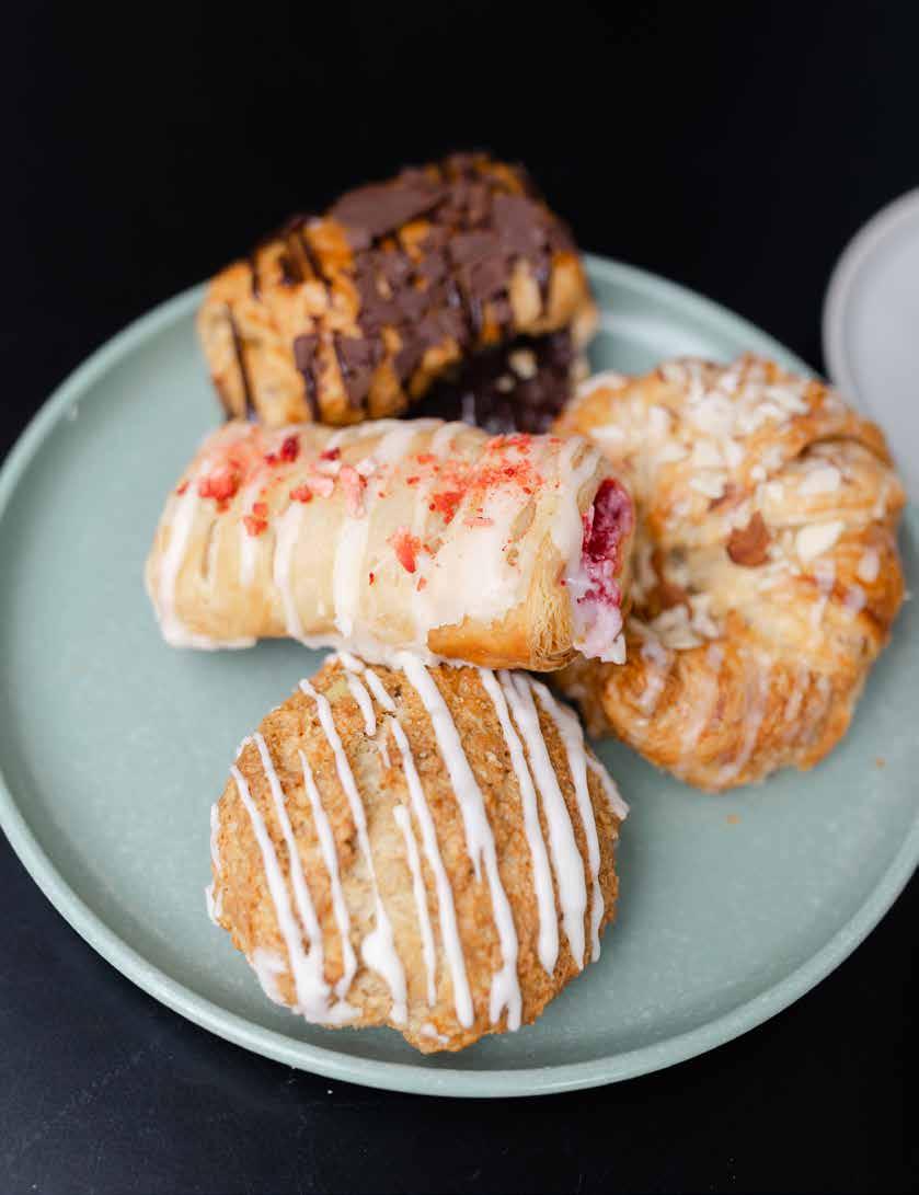 Cinnamon Scone, Death by Chocolate Croissant, Strawberry Cream Cheese Croissant and Almond Croissant
