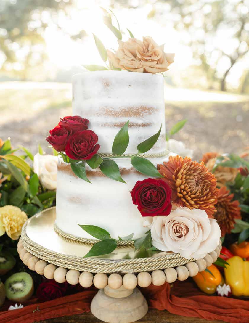 Amidst this sea of autumnal splendor, the table is laden with the season's bounty. Delectable charcuterie and a stunning cake,