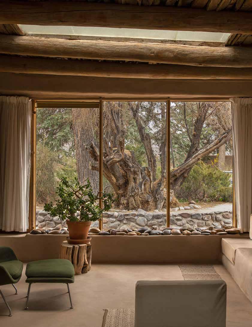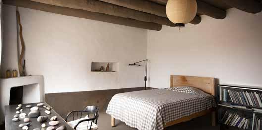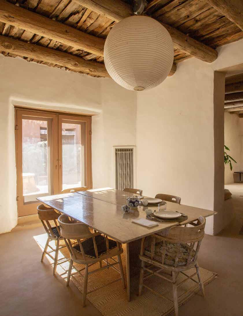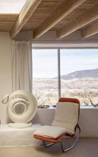 When O’Keeffe finally bought the property a decade later, it required major reconstruction. Local community members were hired to restore it using traditional building methods. Original features were preserved where possible, and more than 22,000 adobe bricks were handmade from nearby earth to expand the house into a pueblo-style hacienda. O’Keeffe also introduced subtle contemporary additions. “She made some pretty modern changes,” Renzoni notes, “including large landscape windows and skylight features you wouldn’t typically see in a traditional Northern New Mexico adobe home.”