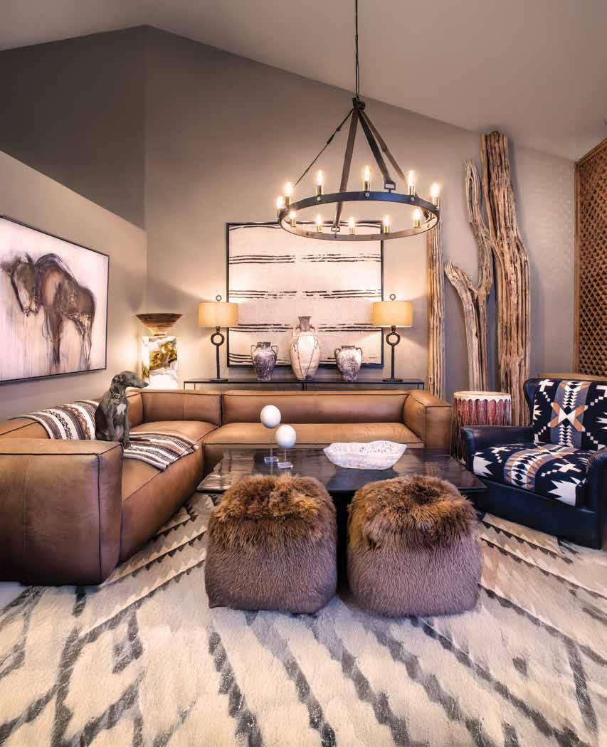 Santa and Cole Tekió Light, Vintage Rainer Draumiller Chairs, American Leather custom couch in Bison Butterscotch, Flos Bellhop lamp, BZippy Vase, Plush Moroccan rug