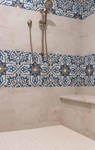 If there’s one place Manz encourages clients to take risks, it’s the powder room. Here, she leaned into terracotta earth tones, layering textures and tile sizes for visual interest and warmth. Patterned and solid tiles work together, while textured wall coverings and a sculptural stone sink elevate the space from functional to delightful.