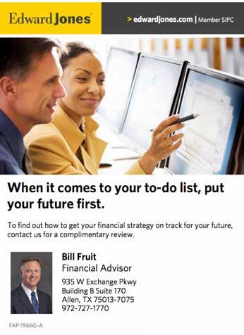 LEGAL SERVICES 214.789.4735 SoftDivorce com Palmer Law Group I N D U S T R Y E X P E R T S ALLEN RESIDENTIAL REAL ESTATE Kelly Pearson, 720 281 3640 Lynda Roundtree, 214.500.3281 KellyPearsonRealtyGroup.com Kelly Pearson Realty ROOFING & SOLAR 469 975 7377 ProNailRoofing.com ProNail Roofing & Solar PAINTING SERVICES 972 867 9792 PhillipsHomeImprovements.com Phillips Home Improvements DENTAL SERVICES 972 727 3941 AllenDentist.com Allen Dental Center C I T Y L I F E S T Y L E INTERIOR DESIGN 469 352 4517 Inspiredinteriorsbymeg com Inspired Interiors by Meg INVESTMENT REAL ESTATE Melanie Brigante, 214.499.6236 Julia de Torrens, 469.910.9595 Delahn com Delahn Realty WINDOW SERVICES 214 225 1922 woodruffwindows.com Woodruff Windows HEATING & AIR SERVICES 469 773 4328 BigDMechanical com Big D Mechanical