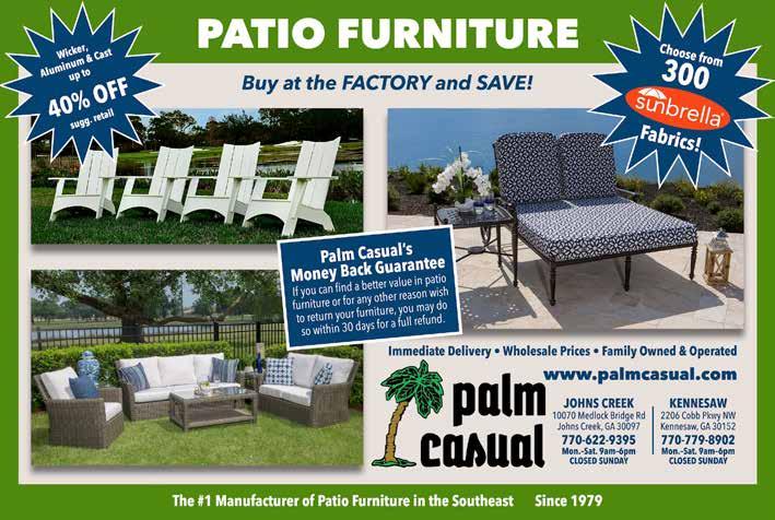 www.scenicsouthlandscaping.com WE ARE YOUR ALL-INCLUSIVE OUTDOOR SOLUTION Full Service Outdoor Specialist DESIGN | CAPRENTRY | MASONRY FREE PATIO GIFT $500+ VALUE WITH ANY 50K OUTDOOR LIVING SPACE RENOVATION! CONTINUED > 11 | CITYLIFESTYLE.COM/ALPHARETTA JUNE 2023