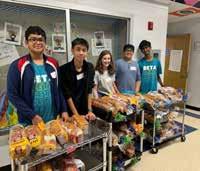Webb Bridge Middle School (WBMS) eighth graders engaged in a Day of Service making over 1,000 sandwiches for The Sandwich Project, a non-profit organization that provides fresh, homemade sandwiches each week to mitigate immediate relief from local food scarcity needs. WBMS students also participated in learning sessions by community partners North Fulton Community Charities and The Drake House. From left are Aarav Gautam, Evan Gan, Lilyan Womack, Jimit Bhatt, and Sai Bagunji.