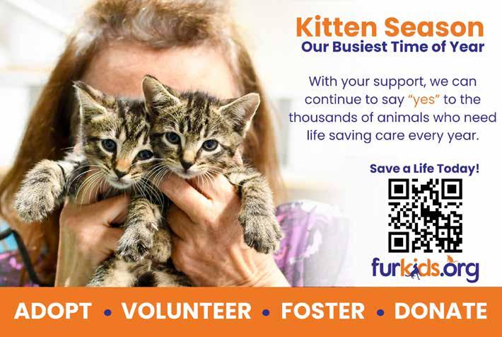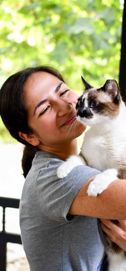 If you’re a cat lover - you’re in the right place! Caretakers help clean free-roam rooms and give the cats the affection they crave. There is also the Purrkids program, where volunteers work one-onone with shy or fearful cats to help their chances of adoption. Cat Shelter volunteer Rachel Clark says, “It’s evident Furkids is a safe, comfortable, and warm place for animals to land. I love my time there, and I love helping those precious babies.”