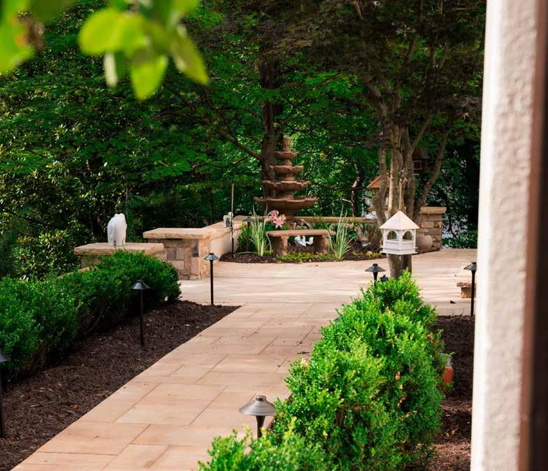 For the front of the Alpharetta home, the homeowners wanted to create some curb appeal. The lot had a very large slope to the road with old, overgrown bushes. The Archadeck team removed those and built two levels of stone retaining walls adding a stone walkway for easy access from the street to the backyard. “We replaced the sidewalk from the driveway to the house with a nice stone walkway that leads to a garden and fountain area. This added a third space for relaxation and reflecting,” explains Cinda.