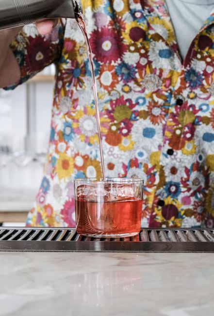 • “You can’t go wrong with fresh flowers,” Hannah says, “but keep bouquets low to not interfere with conversation flowing. For fall, I like richer, jewel-toned florals to mix and match and keep whimsical. I vary glass vases with bur - nished brass for warm fall vibes.”