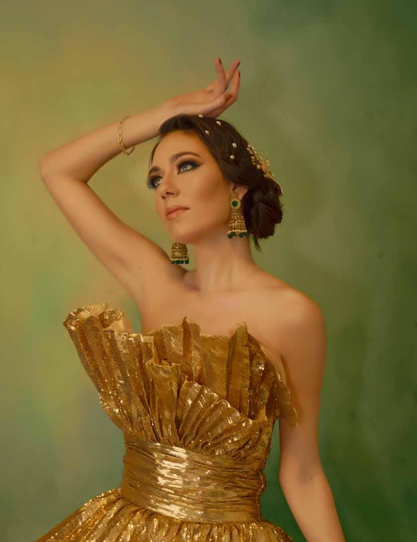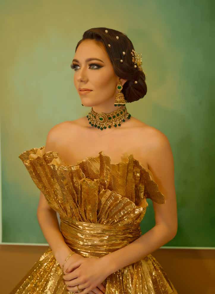 ARTICLE BY BAILEY HALL | PHOTOGRAPHY BY FOLTZ FINE ART PORTRAITSEvamaria Foltz of Foltz Fine Art Portraits has a creative mindset and captures unique portraits tailored specifically to you. Her inspiration starts with the individual person and she considers things like their skin tone, personal style, and other features and then adds specific elements to the portraits to complement those things. For this shoot, Evamaria chose a one-of-a-kind couture gown. “It’s obviously very bold and it was kind of like a glam bridal portrait,” says Evamaria. Baby’s Breath was used as an accessory along with gold and green jewelry. “I actually did research online about the meanings of different flowers and I chose baby’s breath because they are typically used for occasions like weddings. They’re delicate and dainty but even when they are dried out, they still look beautiful. It’s one of those flowers that stays in the same condition and is representative of new marriage, it changes but they stay the same and is still useful,” says Evamaria. The makeup is a natural glam and features pops of green to bring out the eyes and complement the emerald jewels.