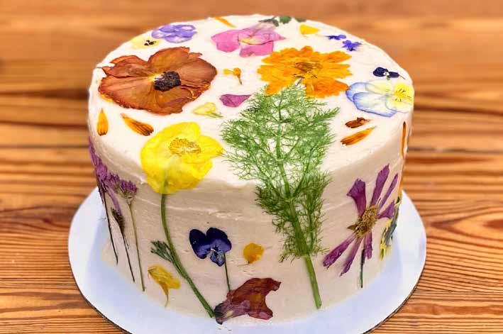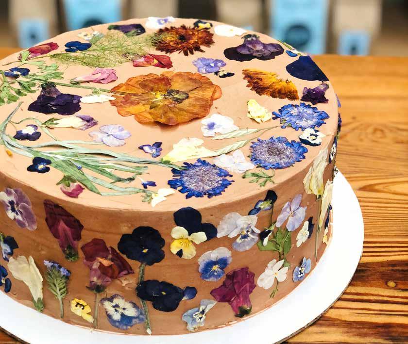Abby Jane excels at small-scale custom cakes that focus on high-quality seasonal ingredients that are sourced locally. We don’t use fondant icing or artificial food colorings at the bakeshop, but we’ve had fun coming up with creative ways to achieve colored effects with naturally-sourced food dyes. We also offer fresh and hand-pressed flowers as decoration, which adds a signature touch.