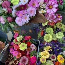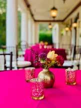 • “You can’t go wrong with fresh flowers,” Hannah says, “but keep bouquets low to not interfere with conversation flowing. For fall, I like richer, jewel-toned florals to mix and match and keep whimsical. I vary glass vases with bur - nished brass for warm fall vibes.”