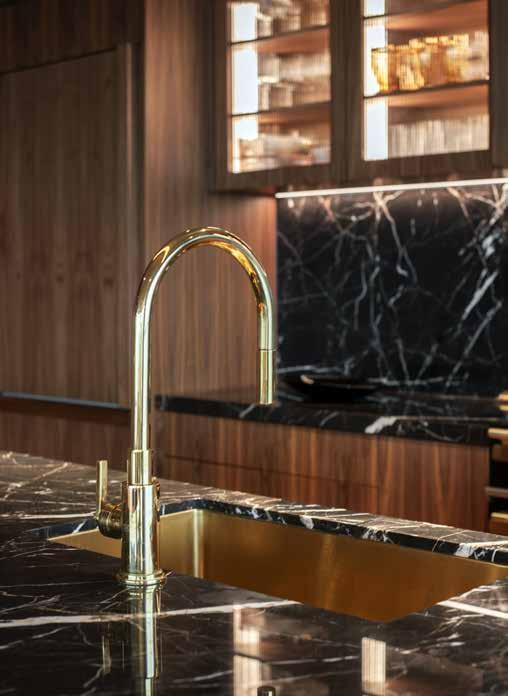 adds another layer of elegance, while the St. Laurent marble countertop and integrated brass sink elevate the island from functional surface to sculptural centerpiece. It’s a moment that feels both intentional and indulgent.