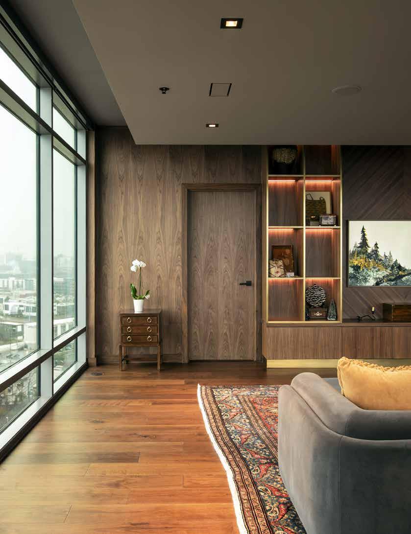Cabinetry played a pivotal role in achieving the final look. Rather than acting as a backdrop, it becomes an architectural element in its own right. The walnut cabinetry adds rhythm and continuity, while custom details elevate it beyond standard millwork. Every line, proportion, and finish was carefully considered to support the overall design narrative.