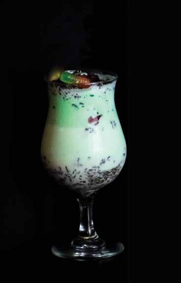 Crush 5-8 Oreos inside a plastic bag. Layer the bottom of a glass with half of the crushed Oreos to make a nice base. Add 2-3 scoops of mint chocolate chip ice cream and fill the rest of the glass with cold milk. Add another layer of crushed Oreos to float on top. Finish with 2-3 gummy worms around the top and enjoy!