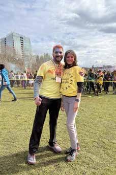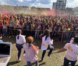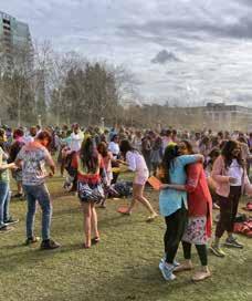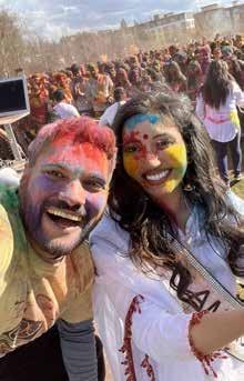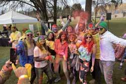 22: The crowd starting to have fun with colors at the 2023 CRY Holi celebration. 23: CRY volunteers posing for the camera at Bellevue Downtown Park. 24: Groups taking pictures and throwing colors and dancing their way around Bellevue Downtown Park. 25: Dance performances with the crowd watching on. 26: More dance performances as audience watches at the CRY Holi event. 27: Miss World America 2021 attended and spoke at the event. 28: DJ RDX playing music for the crowd. Proceeds go toward projects benefiting underprivileged children in India.