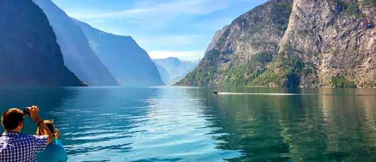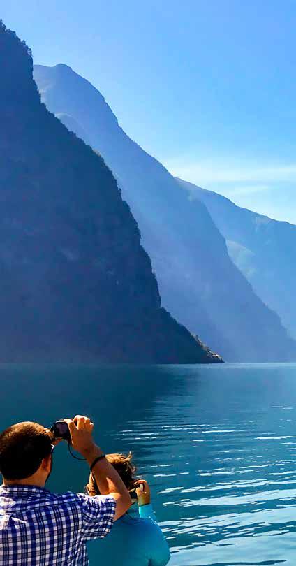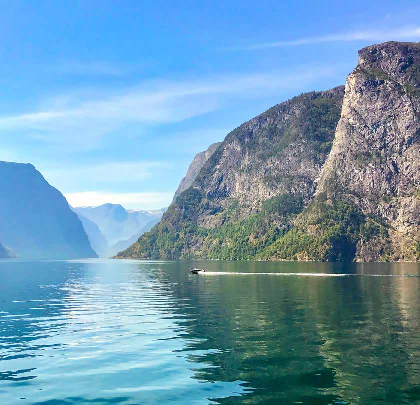 carved out and shaped by an ancient ice age. The call of gulls and lazy gulping of small boats taking on little waves provides a relaxing soundtrack. Cobbled lanes lead past shiplap houses to sheer cliffs. And the mountains are mesmerizing. Rather than jagged, they’re bald and splotchy, with snowfields on top and characteristic cliffs plunging into inky water. I love Norway in the summer.