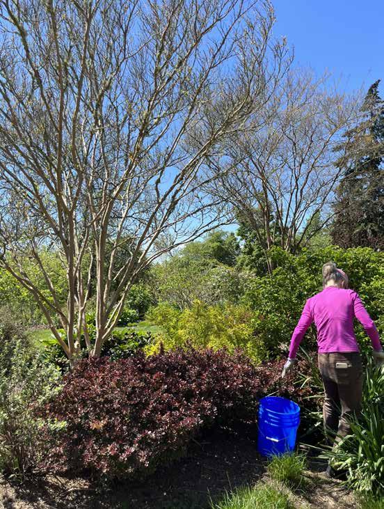 I arrive for my tour on a beautiful spring day and see many shades of foliage illuminated by the sun, punctuated by assorted blooms big and small. Susie’s passion for the garden and the plants growing in it is immediately evident. “I have been involved with the garden at different levels since its inception over 30 years ago. Now I do the floral arrangements for events, work in our Perennial Border which is the largest such border in the United States run by volunteers, and obviously I am a docent,” she says. She introduces me to volunteers and employees and describes how the park started out as 7.5 acres of private arboretum land, deeded to the City of Bellevue with the provision that it remain a public park. Three more land acquisitions in various forms add up to the 53 acres that comprise the park today.