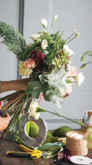 Step 2: Now it’s arranging time — think focal and filler. The best way to start the arranging process is by choosing your most interesting or favorite flowers — this will be your focal point. Hold the focal flower(s) upright and add your supporting blooms around it. Make sure to turn the bouquet as you build so that the design is as desired. Once this is complete, add your filler flowers to finalize the look. Filler options include baby’s breath, ivy, fern, eucalyptus and more.