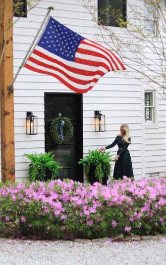 The house itself is classic Southern style with white exteriors and charming touches: greenery, colorful landscaping, waving American flags. Blues and whites dominate the color scheme, warmed up by natural wood tones. But step inside and let the whimsy unfold into an expertly curated haven nodding to the land’s moniker and the family’s personality, like a gallery wall filled with meaningful art to greet guests.