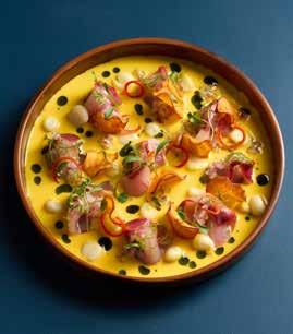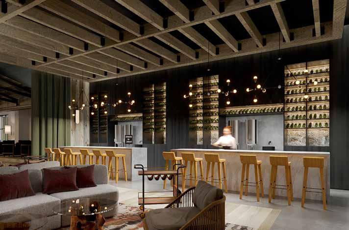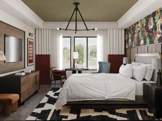 Inside, 164 guestrooms and suites pair elevated comfort with artisan detail. Think Mascioni linens woven in Italy, spastyle bathrooms dressed in pale stone, and balconies that open toward a horizon of rolling hills. Subtle design touches, from textured artwork to the curve of a wine glass echoed in a lamp’s silhouette, bring a sense of story to every corner.
