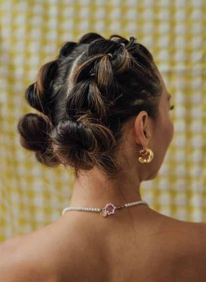 Part hair down the center. Create pullthrough braids on each side of the head. Tie elastic at the end of the braids to create a ponytail at the nape of the neck. For extra volume in the buns, tease the hair in the ponytail before twisting it into a bun. Secure with hair pins and... Voilà!