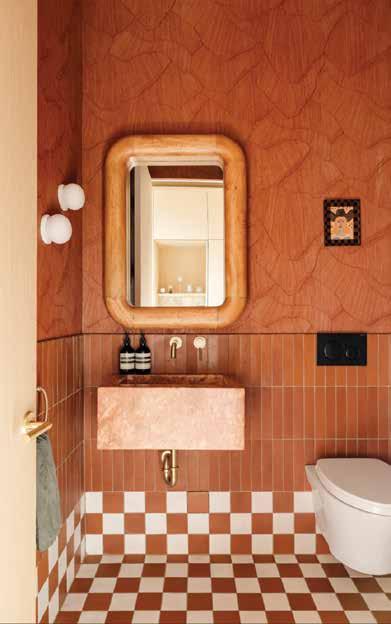 Particular Tile in Satin Terracotta and Vanilla Bean, Arté Wallcovering Shards in Brick Red, Red travertine sink, Rachel Donath chunky mirror, Playful art work by Olivia Fields