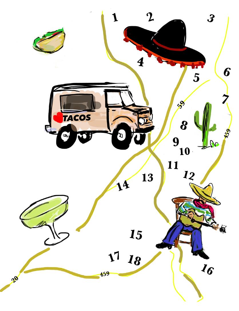 PLEASE NOTE, THE MAP ON THE RIGHT IS FOR FUN AND INSPIRATION. FOR JON O’NEAL’S LIVE GOOGLE MAP (AND CORRESPONDING DESCRIPTIONS) PLEASE VISIT THE INSTAGRAM PROFILE, @BIRMINGHAMTACOS.