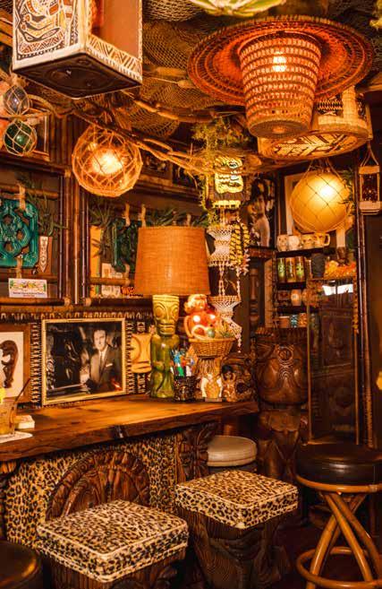 The vast majority of the decor — the archival menus and photos hung on walls, the Tiki mugs and statuettes on shelves, the Tongan tapa cloth softening the ceiling — came from White’s cache. The bar and light fixtures came later.