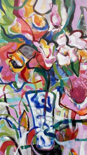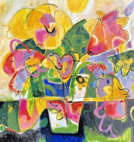 Artistic tools are not limited to the typical brushes either; anything from brooms to twigs to books filled with wallpaper samples can be found in the studio. Yellows, pinks, teals, emeralds and all other bright, fanciful hues are Bokas’ favorites to work with — and never the same way twice. “I’ve always liked bold, bright colors,” he says. “I love going to the art supply store and picking up colors I’ve not used before. When working on a painting, I try to use a variety of each color. For instance, I’ll never use just one shade of green and never straight out of the tube. I always experiment and create variations.”