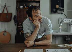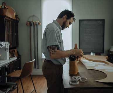 Slattery and his wife, Kaitlin, co-owners of Dreamers Supply Co., vacationed in the city of Savannah for their wedding anniversary and were inspired to attend SCAD. Though making simple leather pouches was already his hobby, Slattery says “he’d never put two and two together” to realize he could become a true leather designer. After graduating from SCAD, the couple moved to France for a residency and honed their skills: illustration for her, leatherwork for him. “It was life-changing being in France, and we received an honorarium to launch our store with other makers and artists,” he says.