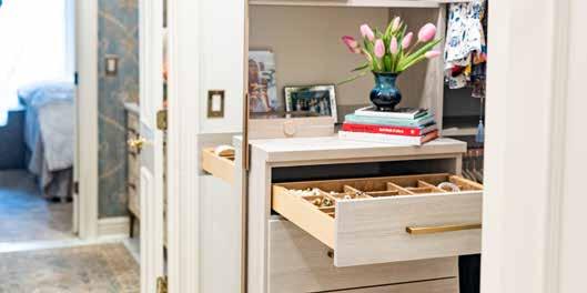 3/ “The mirror makes it!” After seeing inspiration on Instagram, Liz knew she wanted to incorporate a full-length mirror to conceal her shoe collection. 4/ Generously proportioned jewelry organizers neatly contain Liz’s baubles, while the counter above displays family photos.