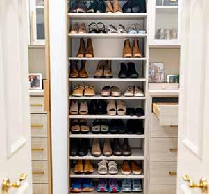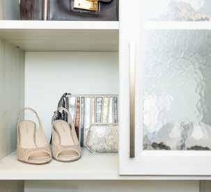 1/ The Thustons chose brushed gold hardware and cabinets in Misty Orchard, a soothing off-white finish. Here, Liz’s work as a stylist shines through her display of handbags and shoes. 2/ Bobby’s side of the closet includes dual hangers for bathrobes and thoughtful amenities like pull-out tie racks and valet rods. 1/ Spraylite glass provides privacy and keeps the look streamlined and clean. 2/ A laundry hamper is integrated into the lower drawer on Bobby’s side of the closet. 3/ Liz’s shoes are tidily kept behind the full length mirror.