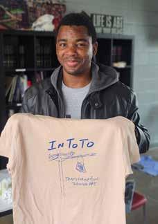 Firehouse Shelter guest, Lee, holds a t-shirt designed by 1920 Club member, Destiny, that he screen printed by hand.
