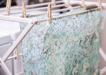 Over time, the silk scarves have become her signature. She tests color combinations on scraps of fabric, adjusting tones before committing them to a full scarf. On marbling days, the silk must be treated the night before, then carefully laid across the bath so the paint can transfer to the fabric in a single motion.